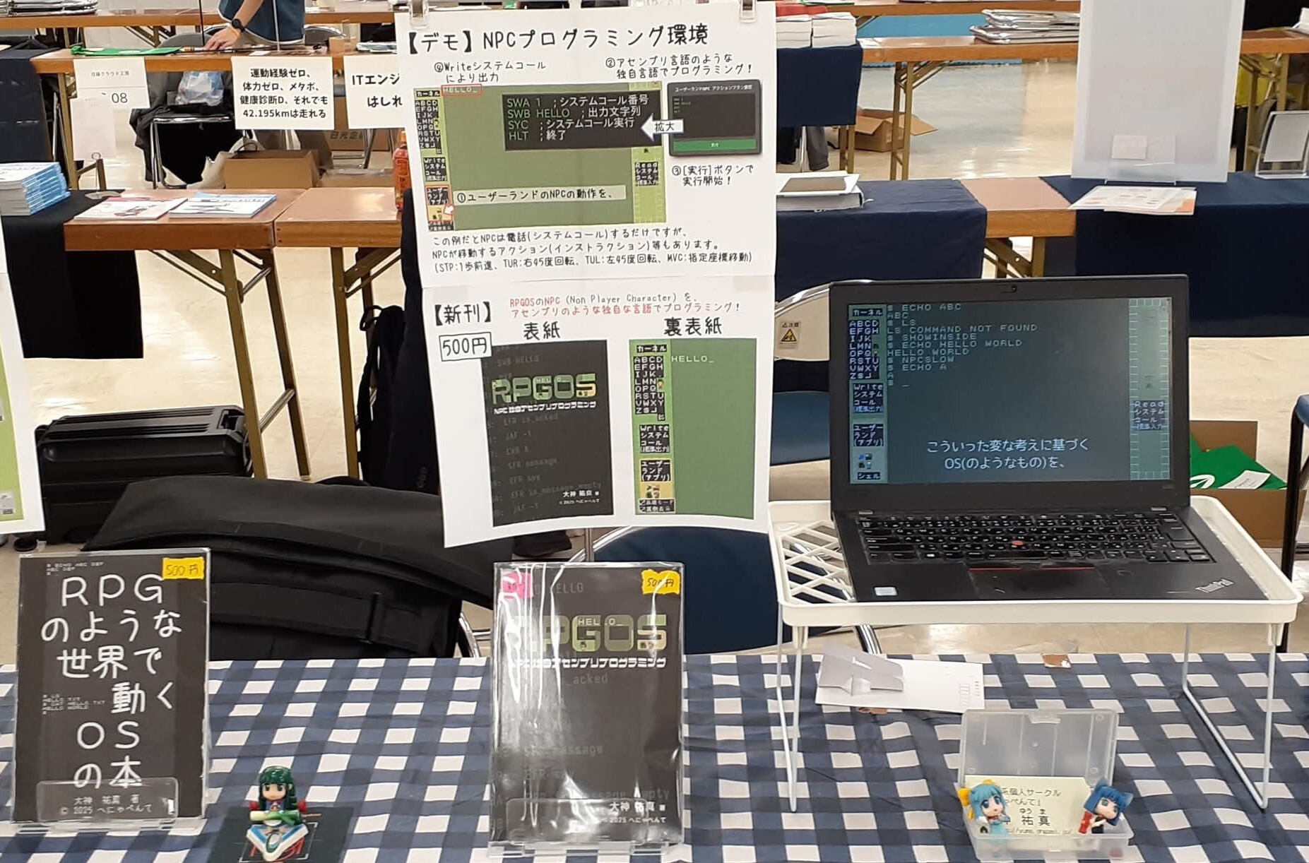 | 12 | へにゃぺんて | へにゃぺんてでは、独自なOSの制作を個人で行っています。最近は「RPGOS」というものを制作しており、そのデモやそれを解説した同人誌の展示を行う予定です。RPGOSは、RPGゲームのような世界へOS内部の動きを翻訳して表現する取り組みです。それにより、エンジニアに限らず一般の方にもOSの仕組みに親しんでいただくコンテンツとなることを目指しています。 | ![]() |